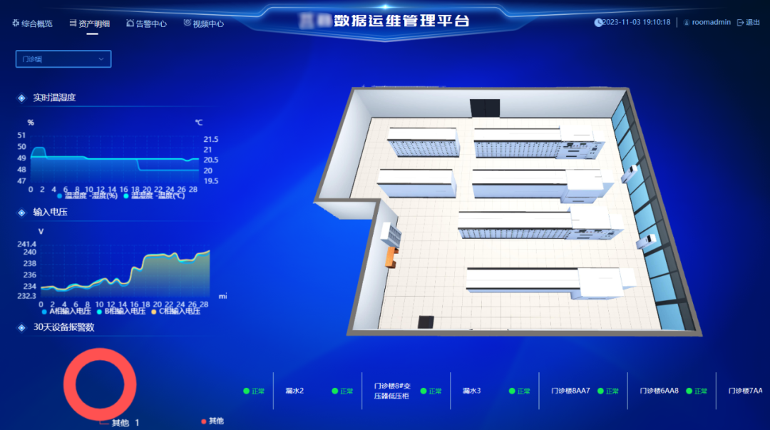 门诊楼/病房楼:包含14组变压器的电表监测和34套漏电监测,以及16路视频监控和10套定位漏水监测。采用嘉晨科技自主研发IEDAS系统采集,对该区域的监测数据实施上传至服务器,集中采集管理。