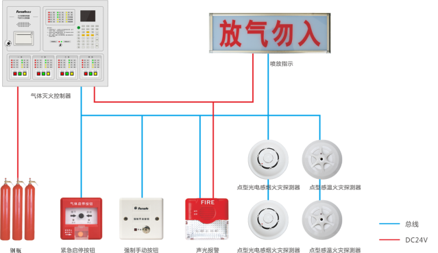 设置一个气体喷放指示灯,该指示灯由灭火控制器接收到气体管路上的压力开关动作后的返回信号来控制。其他报警系统的设备如手动报警按钮、消防警铃等,应按照消防规范进行设置。04